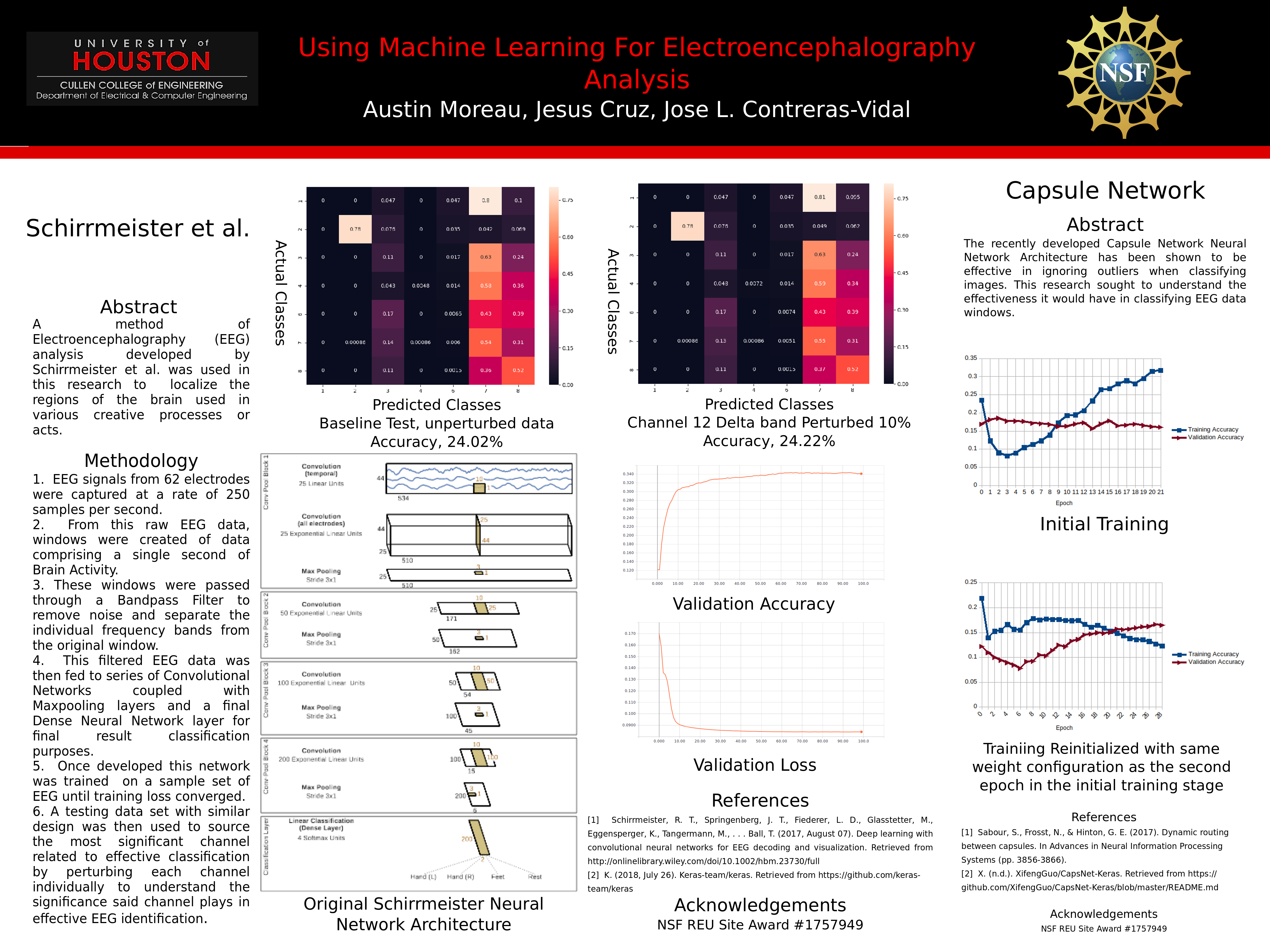 Abstract: Classifying EEG signals using state of the art deep learning techniques still leaves much to be desired. EEG is known for issues related to statistical noise as well as variance between subjects and even between sessions. The seminal research paper written by Schirrmeister et al., “Deep Learning With Convolutional Neural Networks for EEG Decoding and Visualization” described a deep learning architecture that was shown to be capable of classifying EEG with an accuracy of 92.4%. The EEG in question was EEG captured during the movement of hands and feet of research subjects. The architecture developed by Schirrmeitster et al. was also used to extract feature meaningfulness. Through perturbation of data and analysis of the subsequent change in classification accuracy, the researchers were capable of discovering the EEG channels and neuronal activation frequency bands most necessary in each class. This research was replicated with the intent of classifying actions related to the art production process while preserving the architecture developed in the original paper.