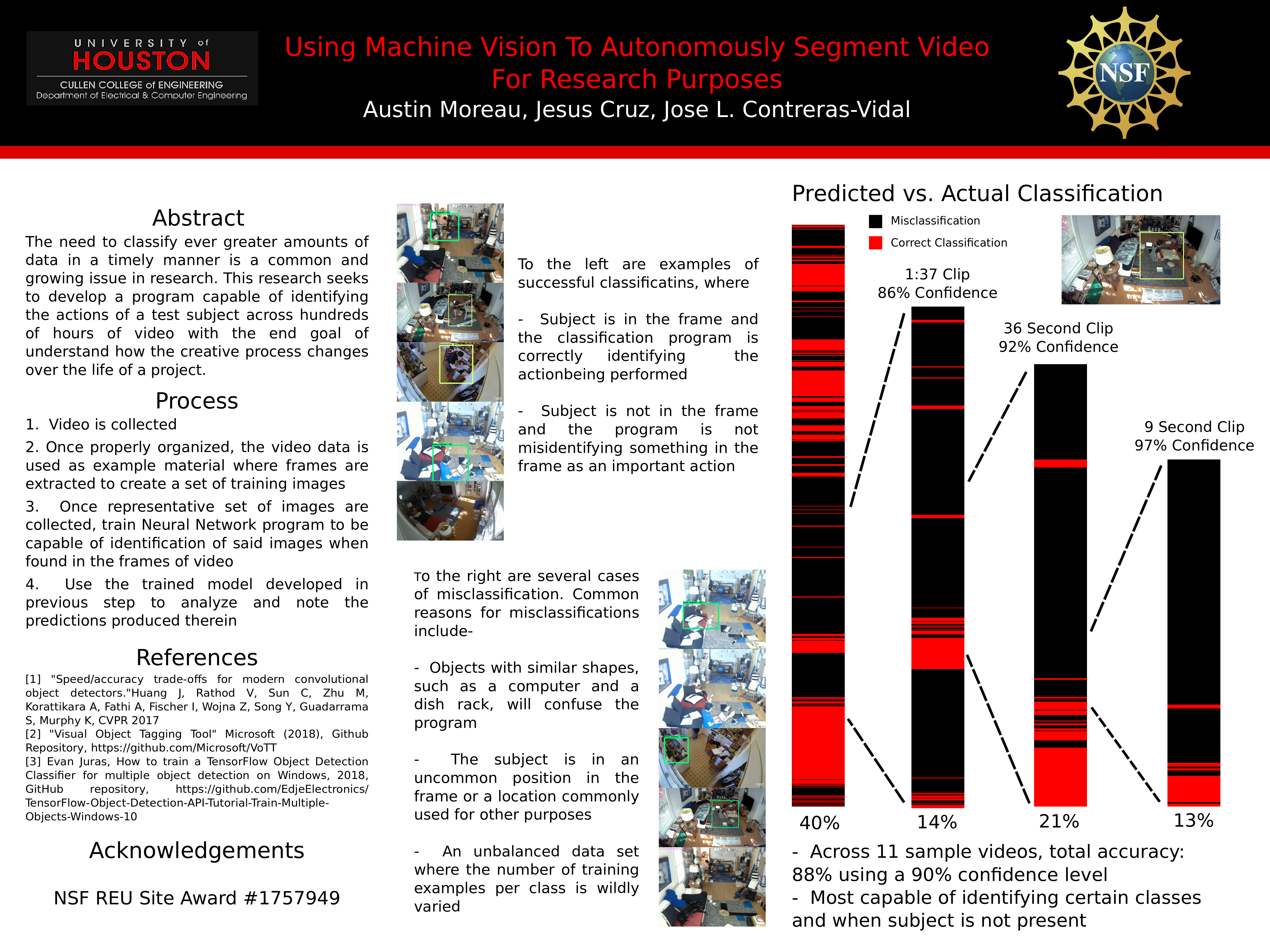 Abstract: The necessity for expedient documentation of the actions performed by subjects under recorded observation is necessary for many fields of research to effect the creation of a reference database for correlation of actions and stimuli. This research in particular sought to develop a program capable of documenting the actions a research subject was performing while wearing a cap designed to capture electroencephalography (EEG) signals. The subject in question was under observation for several months in total, which resulted in hundreds of hours of videos requiring documentation to understand how the subject’s activities would appear when represented in EEG. Documenting this amount of video by hand would require weeks of work by a team of volunteers typically. With the creation of software which takes advantage of the latest techniques in machine vision for object detection and recognition, this research resulted in the development of a rudimentary system to accomplish the same goal of video annotation automatically without any supervision from a human. The program was developed and then used to segment 11 sample videos for practical use-case quantification in the identification of classification accuracy across five classes of actions. The program was able to classify 88% of frames correctly across these sample videos.